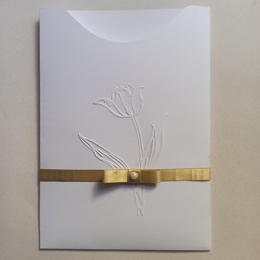 Apresentamos nosso elegante Envelope 15x21 Branco com um sofisticado relevo seco de tulipa que acrescenta um toque de delicadeza e exclusividade. Feito com cuidado nos detalhes, este envelope é adornado com uma fita dourada, proporcionando um acabamento luxuoso que fará seus convites se destacarem.